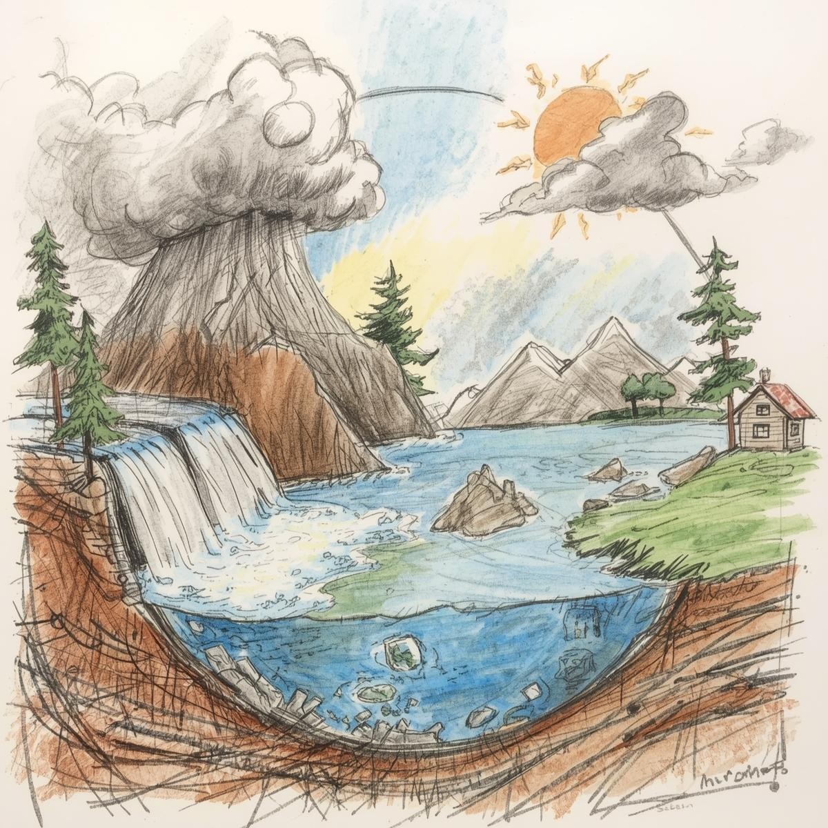 The Hydrological Cycle describes how water continuously moves through the Earth’s system. Water evaporates from oceans, lakes, and soils, forms clouds through condensation, and returns to the surface as precipitation (rain, snow, hail). Once on land, it may infiltrate into the ground to recharge groundwater, flow across the surface as runoff into rivers and lakes, or be taken up by plants and released back to the atmosphere through transpiration. This ongoing cycle regulates climate, sustains ecosystems, and provides fresh water for life.